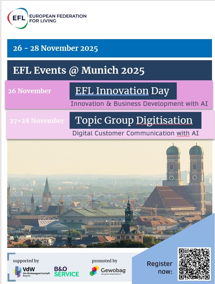 For this autumn’s EFL event package around the topic of AI as a driver of innovation and digital customer communication in the housing sector from 26 to 28 November 2025.The preliminary programme will be updated regularly, so stay tuned and check back often.